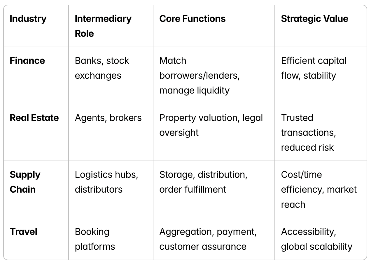 Intermediaries are not new. They exist wherever complexity must be managed and trust must be enforced. Finance, real estate, logistics, and travel all rely on them. Without intermediaries, these industries would collapse into inefficiency.